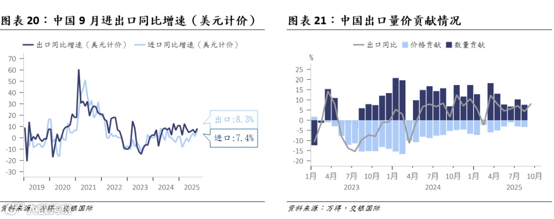 前三季度进出口总额同比增长4.0%,其中出口增长7.1%、进口下降0.2%,贸易顺差继续扩大。9月出口以美元计价同比增长8.3%,较8月反弹3.9个百分点,而进口增长7.4%,增速加快6.1个百分点,连续四个月为正并创下自2024年5月以来新高,近月数据持续改善也反映了外贸韧性的可持续性。