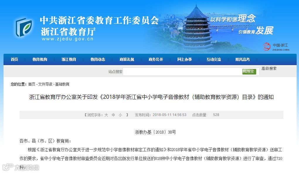 2018年5月11日,浙江省教育厅下发关于印发《2018学年浙江省中小学电子音像教材(辅助教育教学资源)目录》的通知。
