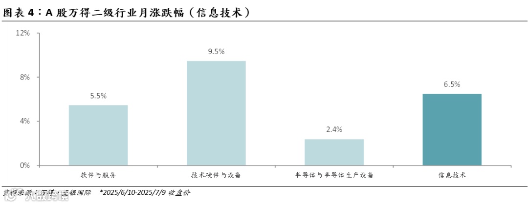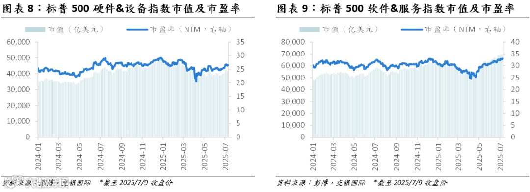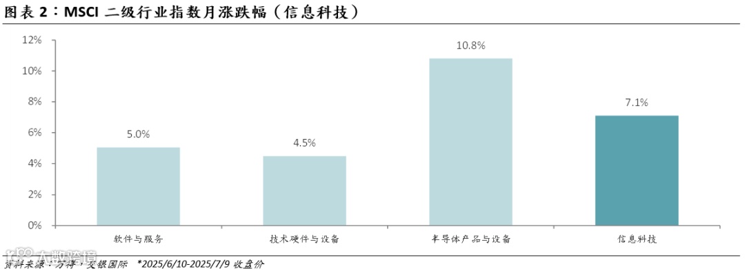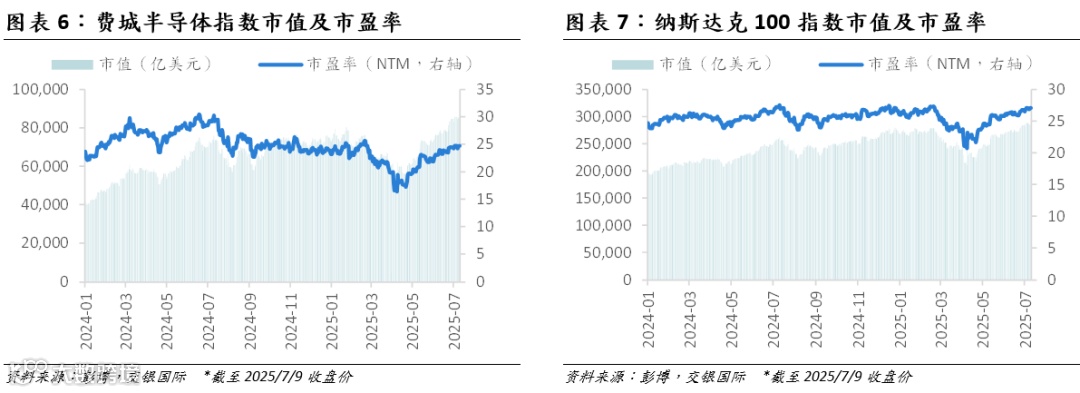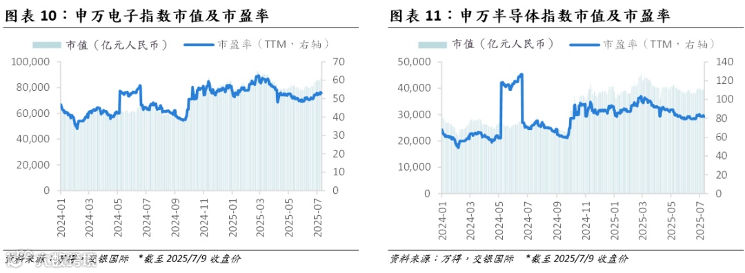 2025年6月10日至7月9日,MSCI信息科技指数涨7.1%,继续跑赢MSCI全球指数(+3.0%)。Wind信息技术指数涨6.5%,继续跑赢沪深300(+3.3%)。受部分行业竞争环境影响,恒生科技指数跌3.0%,跑输恒生指数(-1.1%)。全球股市维持强劲走势,且科技股普遍相比大盘走势更加强劲。MSCI全球指数/纳斯达克100较4月7日的低位分别反弹约24%/31%,并不断突破历史新高。估值方面,美股相关指数(图表6-9)的市盈率(NTM)最近一个月延续反弹,纳斯达克100指数、标普500硬件/设备指数市盈率已达到2020年以来高位,但费城半导体指数离2024年高位尚有距离。A股估值也有所回升,申万电子指数市盈率涨3.3倍,申万半导体指数市盈率涨1.7倍。