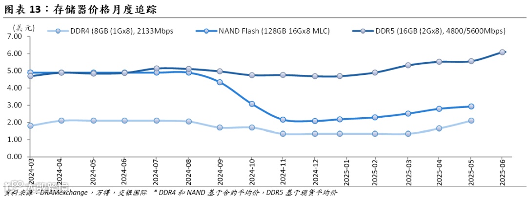 根据DRAMexchange数据,DDR4(8GB)合约平均价4月/5月出现较明显的上涨,由3月的1.35美元涨至4月的2.10美元(+55.6%),市场出现供不应求。DDR5(16GB)现货平均价6月开始恢复高速增长,7月9日现货平均价为6.07美元。NAND Flash(128GB)合约平均价延续年初以来的增长趋势,5月价格2.923美元已经相比去年底上涨0.843美元(+40.5%)。消息面上,三大存储原厂陆续宣布DDR4停产,根据经济日报,DDR4现货价格6月在短短两周上涨约五成,并出现DDR4和DDR5价格倒挂的现象。我们认为,关税不确定性缓解后持续补库影响下,存储价格对今年智能手机和消费电子的成本压力仍在。