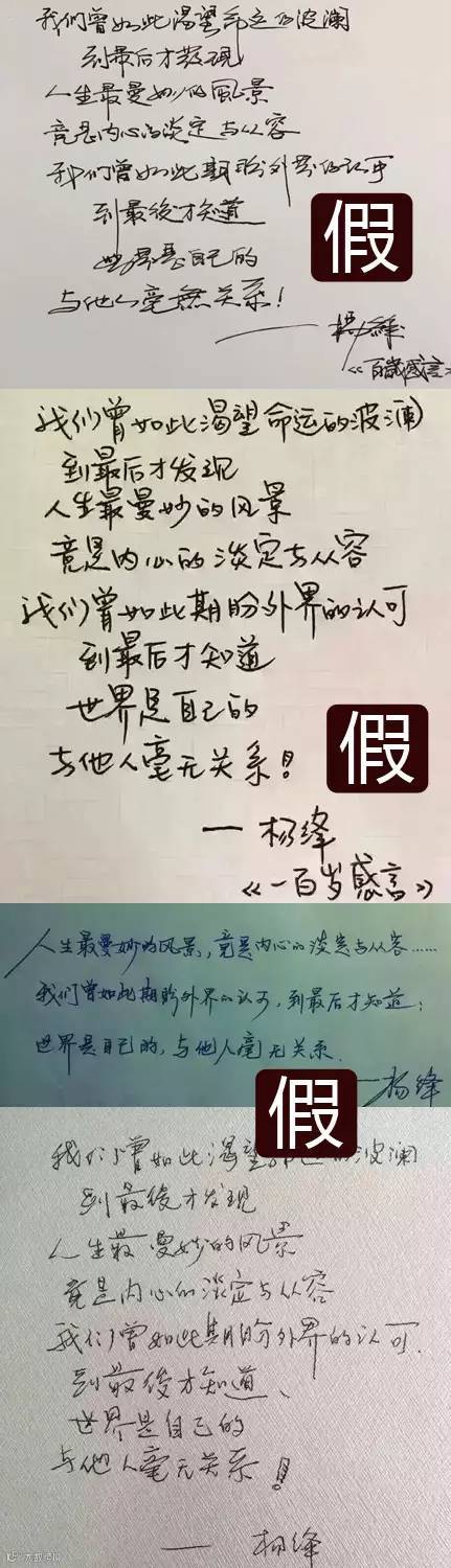 杨绛先生的《一百岁感言》,仅在文章开头写到:“我今年一百岁,已经走到了人生的边缘,我无法确知自己还能往前走多远,寿命是不由自主的,但我很清楚我快‘回家’了。我得洗净这一百年沾染的污秽回家。我没有‘登泰山而小天下’之感,只在自己的小天地里过平静的生活。细想至此,我心静如水,我该平和地迎接每一天,过好每一天,准备回家。”尊重杨绛先生,拒绝所谓百岁感言,请传播真相!
