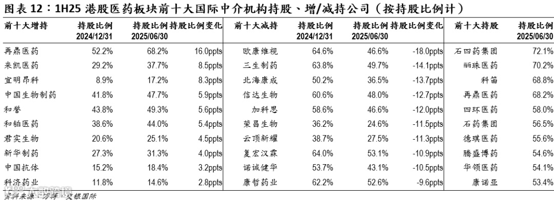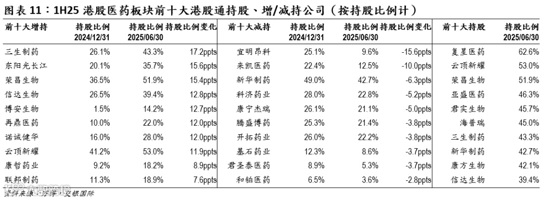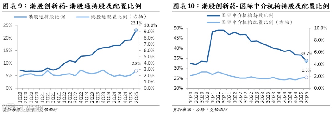 2025年港股内外资在创新药板块(生物科技+处方药)的持仓呈现明显分化趋势。内资通过港股通渠道持续增持,1H25持股比例增加4.1个百分点至23.1%,配置比例同步提升0.7个百分点至2.8%,资金对行业长期价值战略性增配的同时,也需提防个别标的抱团。反观外资,其持股比例自2021年的高位(48.9%)持续回落,自2H24起随着行情回暖继续减持套现,到2Q25末已降至33.7%,配置比例亦长期保持在1.8%以下的低位区间,反映在全球流动性波动、地缘因素、部分标的涨幅较显著的背景下,外资对于港股医药板块维持审慎敞口。