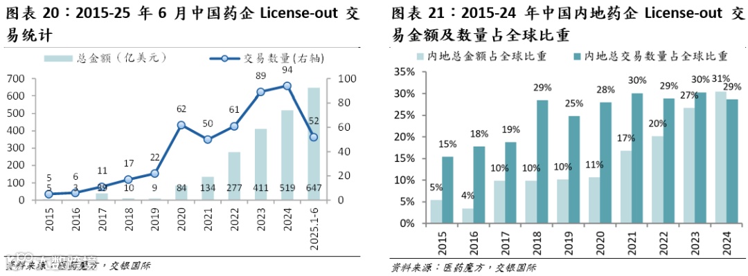 进入2025年,中国创新药出海延续了近年来的强势表现,交易数量和金额均创历史新高。截至2025年6月底,已达成52项出海交易,其中有18项交易的总额超过10亿美元,披露总金额超过647亿美元,已超过2024全年的交易总金额水平。未来,随着中国创新药质量的提升,中国药企有望在国际市场上占据更大的份额,我们预计将会有更多的候选分子获得海外资本的青睐。