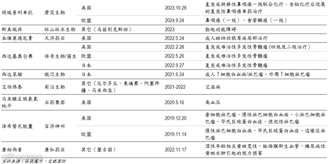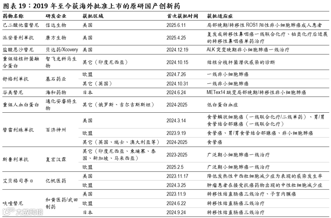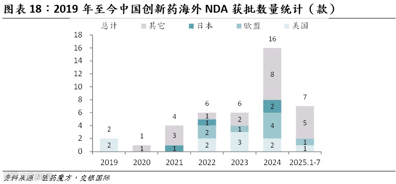 自2019年首个国产创新药泽布替尼胶囊获得FDA批准上市以来,截至2025年7月,共有19款国产原研创新药在海外获批。其中,11款国产原研创新药成功通过FDA审批于美国上市。值得注意的是,从2024年开始,各大药企原研国产创新药自主出海展现出明显的提速趋势:根据医药魔方统计数据,2024年以来共有4款国产创新药获得FDA批准,包括百济神州的替雷利珠单抗、贝达药业/Xcovery的盐酸恩沙替尼、康方生物于2025年4月获批的派安普利单抗,以及信达生物于2025年6月获批的己二酸他雷替尼。2024全年国产原研新药海外NDA获批共16项,显著高于 2019-23年NDA获批数量。