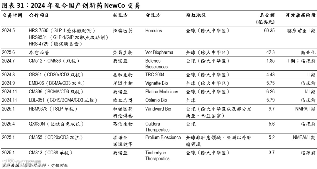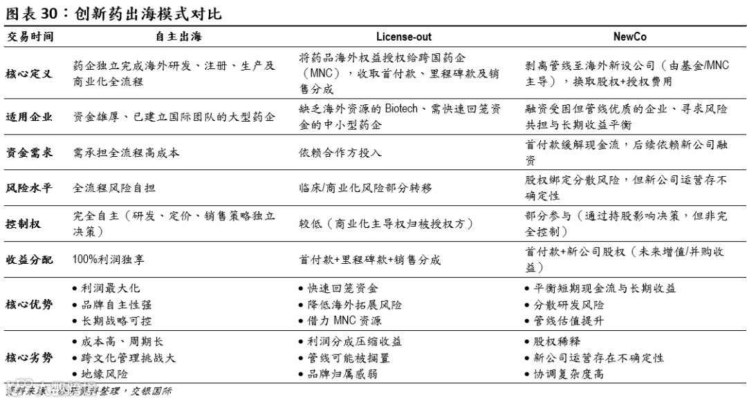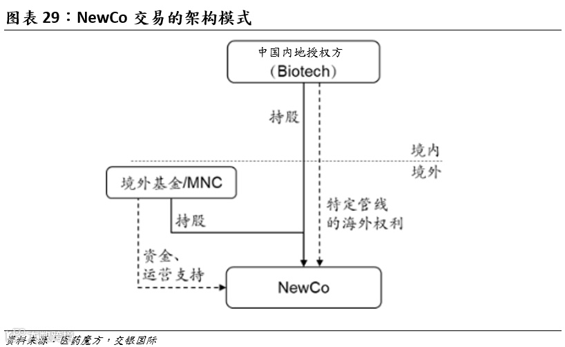 2024年以来,在资本市场压力与国际化战略的双重驱动下,NewCo模式应运而生,为中国创新药企开辟了除自主出海和license-out之外的第三条出海路径选择。通过引入海外资本,NewCo模式既解决了企业短期资金瓶颈,其在NewCo 实体中的持股也使创新药企有机会享受产品全球开发带来的资本增值,为中国创新药企构建了出海的新路径。
