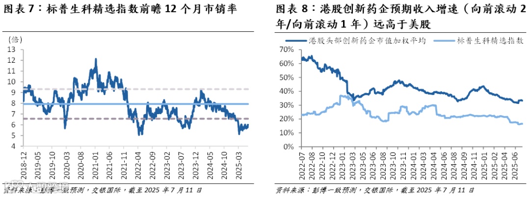 我们认为,本轮港股创新药行情核心驱动力是价值重估,当前估值仍具吸引力:1)头部创新药企的前瞻12个月市销率与熊市以来的历史均值基本持平,虽略高于美股可比公司、但营收增长预期亦远高于后者;2)收入达峰时的市销率对于创新药企长期潜力更有指导意义,目前港股龙头在3倍左右,低于美股平均的4倍,个别公司仅有2倍左右;3)1H25内资持续通过港股通加仓,但外资在创新药中的仓位处于底部,后者可能偏好基本面扎实、性价比显著的标的。