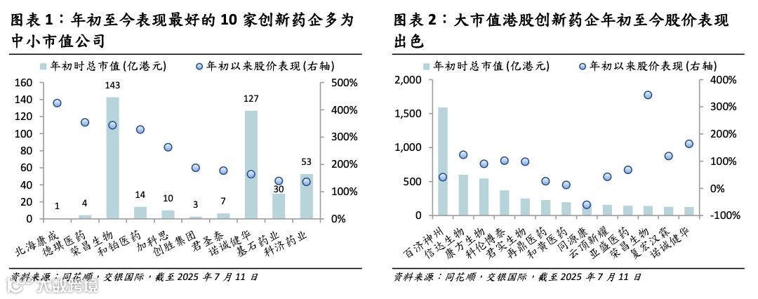 本轮港股医药行情自2024年9月启动,主要由创新药板块拉动,经过4Q24调整,进入2025年后表现亮眼。根据我们的统计,年初以来港股生物科技公司(包括纯创新药公司)按市值加权平均上涨76%,跑赢恒生医疗指数(+54%)和恒生指数(+20%)。板块中,大中市值公司(2024年底市值≥100亿港元)平均上涨75%,小市值公司平均上涨95%,我们认为和小市值公司股价弹性较大、反弹前普遍被大幅低估等因素有关。
