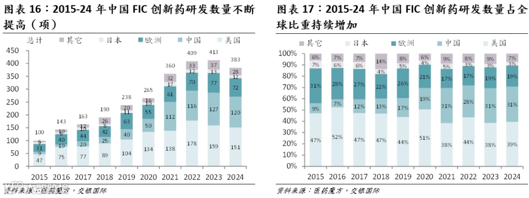 从管线质量来看,中国医药创新正在经历深刻转型,从过去依赖模仿和快速跟随(me-too/fast-follow)的研发模式,逐步升级为改进/同类最佳研发策略(me-better/best-in-class),最终聚焦源头创新、拥有全球竞争力的同类首创(first-in-class,FIC)项目。根据医药魔方统计,2015年中国企业进入临床阶段的FIC项目仅有9项,占全球总量不足10%;而到2024年,该类项目数量已增至120项,全球占比超过30%。