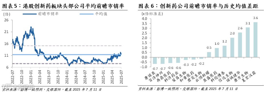 板块仍整体低估,价值重估后大部分标的仍有上行机会:对于港股创新药板块的头部公司(市值100亿港元以上),当前市值加权平均前瞻12个月市销率约11.8倍,与过去三年平均基本一致。