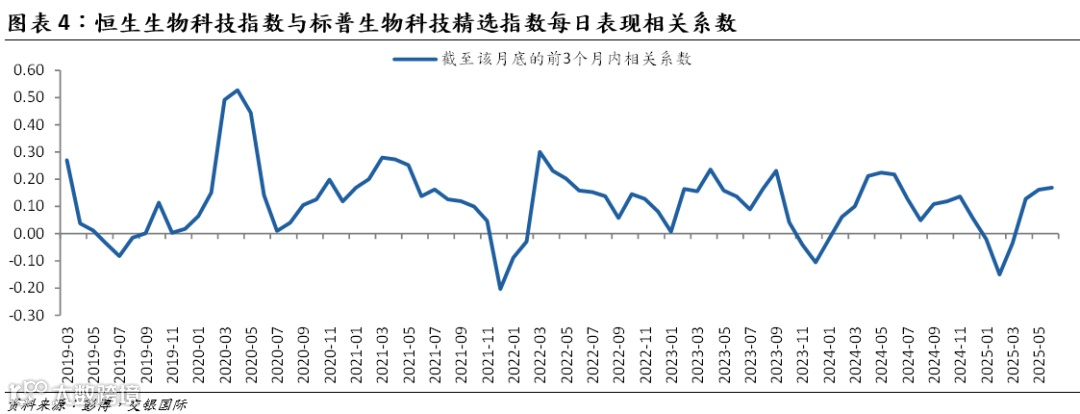港股创新药逐步走出独立于美股的行情:观察恒生生科指数与标普生物科技精选行业指数表现的相关性,我们发现,两者的相关性正在逐步减弱。过去两年内,两者表现的相关系数已降至0.25以内,并多次出现负相关,而大部分时间恒生生科指数大幅跑输标普生物科技精选行业指数(图表3红色高亮区域),但时至今日,恒生生科指数已快速补回差距(2018年末至今:+15% vs. +24%)。