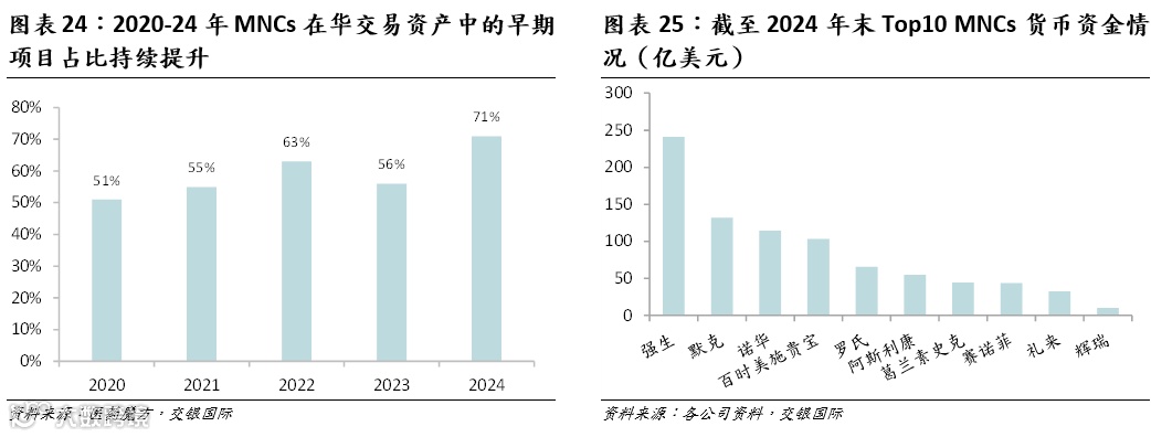 从资产偏好方面来看,一个清晰的趋势是MNCs对中国资产的关注重心正加速向早期研发阶段倾斜。根据摩熵数据统计,2020 年MNCs在华交易的资产处于临床早期(临床前及临床I期)的比例已突破50%。2024 年,这一比重持续攀升至70%以上。这一转变反映出:一方面,MNCs意图通过更早期介入、以更低的交易对价提前锁定潜力FIC/BIC分子;另一方面,这标志着MNCs对中国药企的本土医药创新和药物发现能力的信任度正逐步提升。此外,我们看到大部分MNCs当前维持着充足的现金储备,我们认为这将成为未来中短期内支撑 MNCs 持续对中国创新药资产产生积极交易意向的核心驱动力之一。