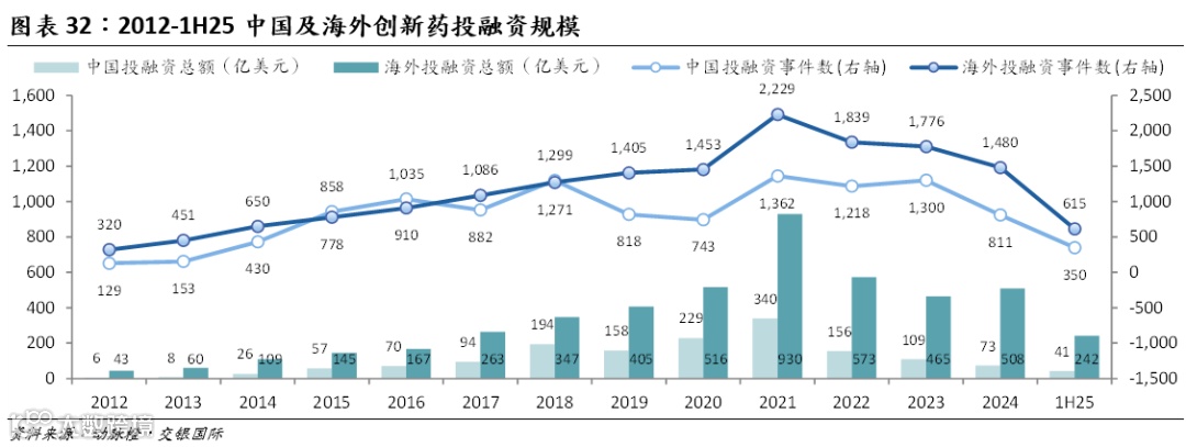 全球医疗健康领域投融资在经历2021年的历史性高点(全年融资额超3,000亿美元)后进入下行周期。自2024年起,行业迎来关键转折点:2024年,海外医疗健康投融资事件数虽同比减少17%,但投融资总额却同比增加9%至508亿美元,资金向高估值、后期项目集中的趋势显著;2025年1月全球单月融资额冲高至80亿美元,创下过去三年单月融资额新高。中国内地市场也同步显现复苏信号:1H25,二级市场医药板块估值快速修复形成明确拐点,显著提振投资者风险偏好,进而传导至一级市场交易活跃度提升。1H25中国内地融资总额同比反弹至41亿美元,已超越2024全年融资总额的56%。我们预计2H25开始,随着美国降息周期的开启,叠加创新药企现金流改善及多项政策红利释放,二级市场复苏对一级市场的正反馈效应将进一步增强,持续提升市场资金风险偏好、强化生物科技企业的融资能力,催化创新资产的价值重估。
