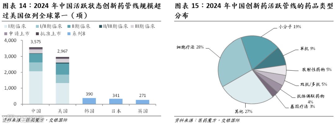 从研发管线的数量来看,根据医药魔方数据,2015-24年间,中国处于活跃状态的创新药管线规模已累计达到3,575项,超过美国的2,967项位列全球首位,并断层式领先于韩国(390项)、日本(341项)等发达国家。在活跃管线的阶段分布上,中国多数管线处于临床早期(I期及I/II期),表明中国创新药研发已处于规模化积累阶段,正持续追赶与国际领先水平的差距。细胞疗法与小分子药物构成国产创新药的核心力量,分别占总活跃管线数量的28%和19%。此外,抗体药物、放射性药物、抗体偶联药物和基因疗法等前沿领域的占比也快速提升,形成多元化创新矩阵。