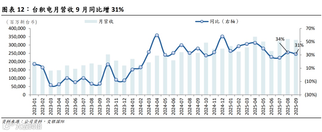 台积电2025年9月营收3,310亿新台币,同比增长31%,环比下降1%。