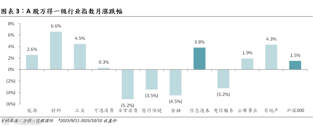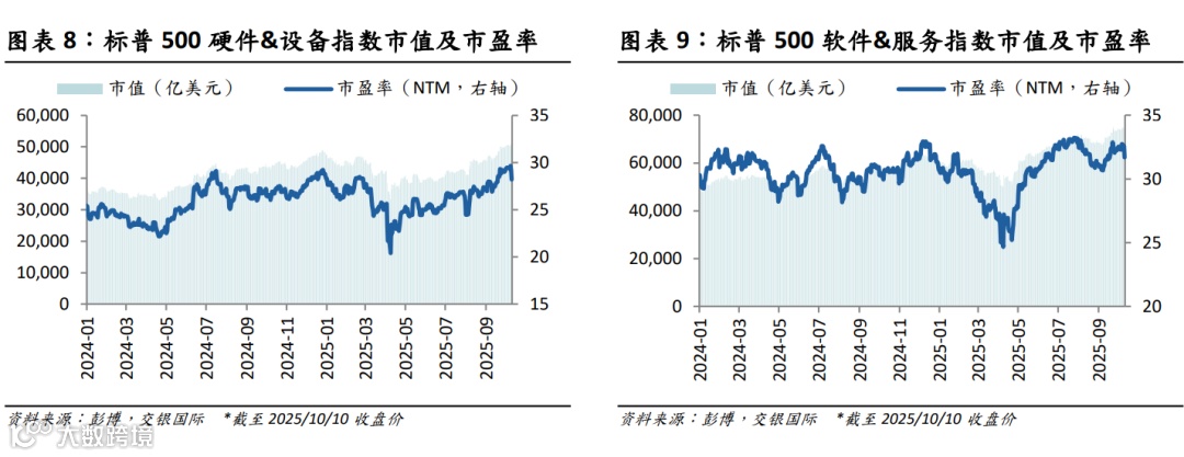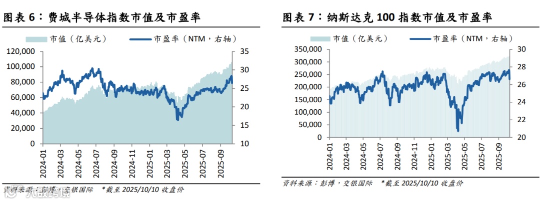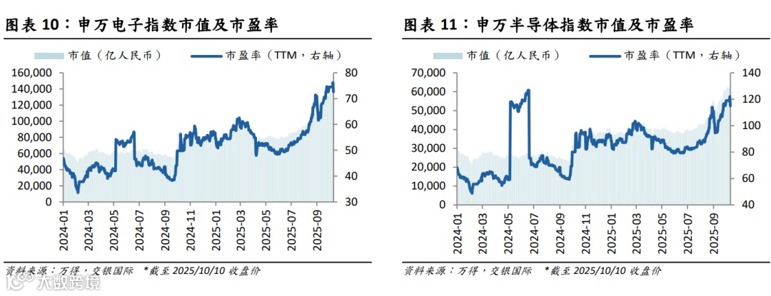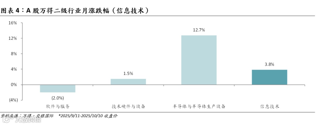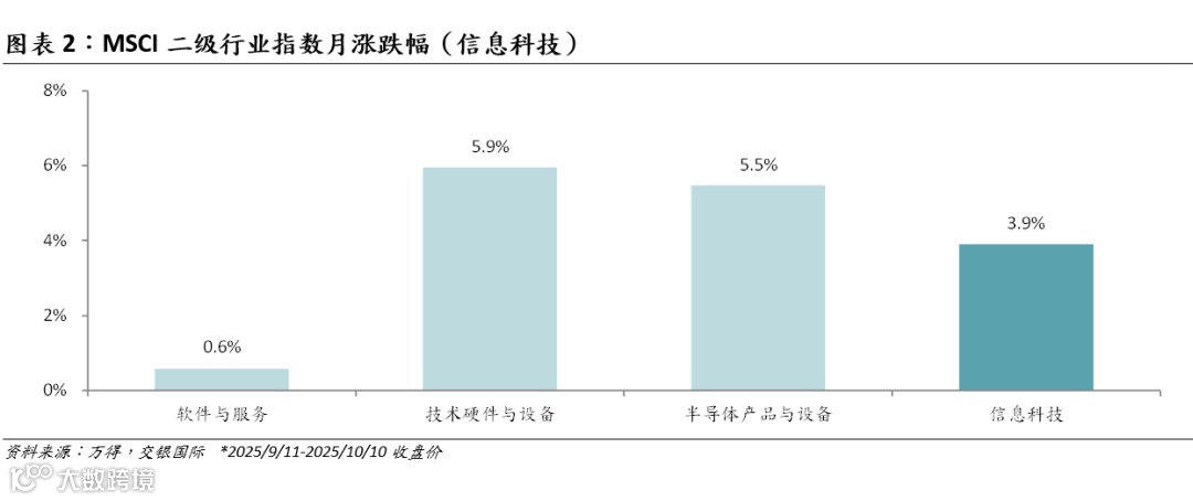 9月11日至10月10日,MSCI信息科技指数涨3.9%,跑赢MSCI全球指数(+0.1%)。Wind信息技术指数涨3.8%,跑赢沪深300(+1.5%)。恒生科技指数涨6.3%,大幅跑赢恒生指数(+0.8%)。从估值角度看,主要美股指数和A股申万电子/半导体指数市盈率均处于较高水平。申万电子指数和申万半导体指数市盈率延续大幅增长,本月分别涨8%和13%。我们认为估值提升或是股价的主要驱动因素,市场或进一步看好AI在2026年后的前景。