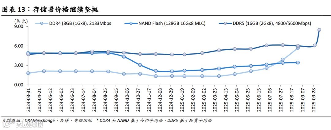 据DRAMexchange数据,DDR5(16GB)现货平均价从9月底的6.0670美元涨至10月9日的8.473美元,9日内涨幅达40%。而DDR4方面,以8GB为例,8月合约平均价环比上升46%。NAND价格最近一个月同样保持坚挺,但涨幅不及DRAM相关产品。我们认为,AI基础设施建设带来的对HBM等高端存储的强劲需求有望进一步拓展到不同类型的DRAM领域。我们维持对于存储价格将继续坚挺的判断,预计DRAM的强劲价格将延续至3Q26(之前为1H26),而NAND价格也有望保持在较强水平直至1H26(之前为1Q26)。
