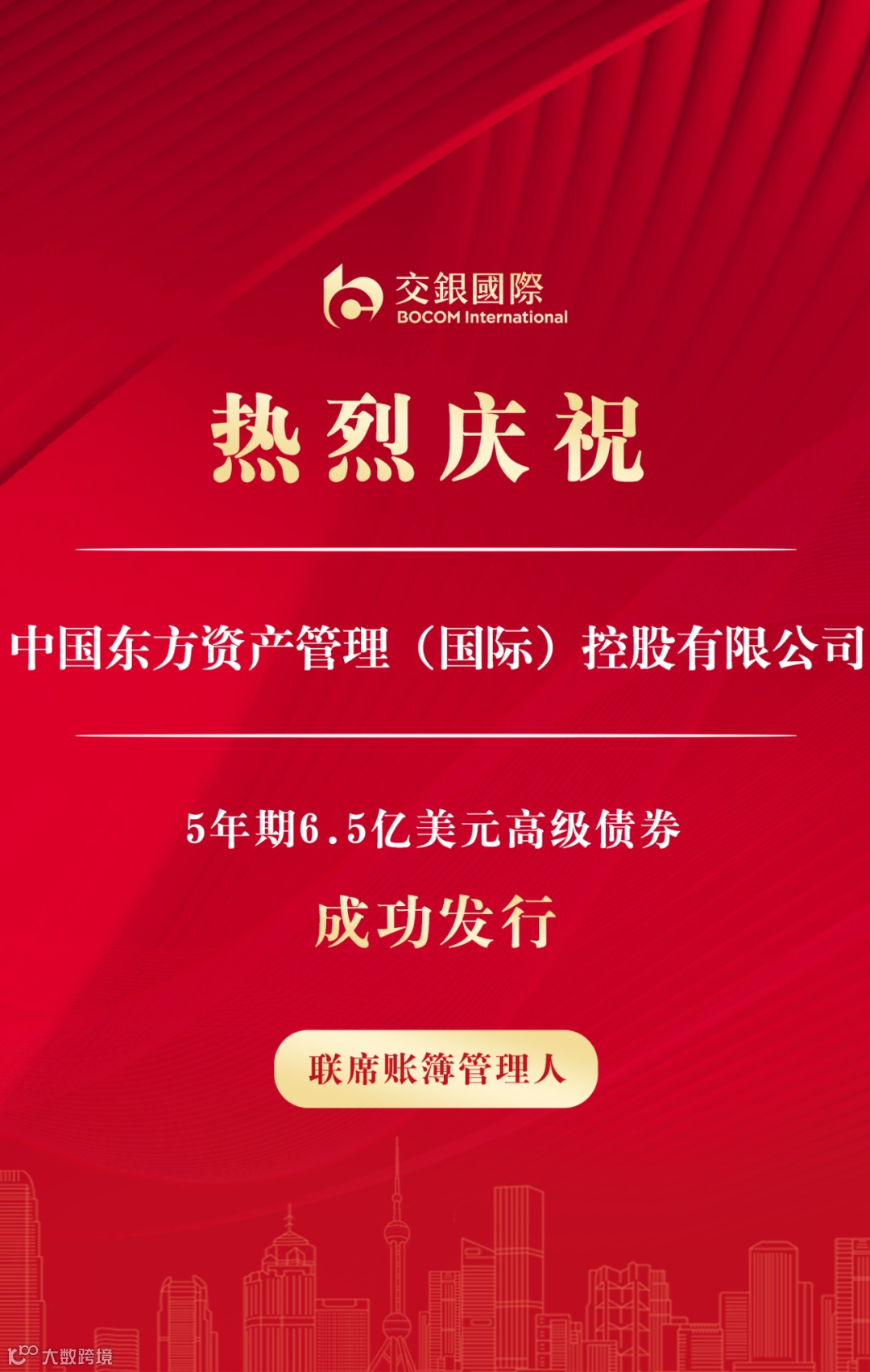 5月30日,交银国际作为联席账簿管理人助力中国东方资产管理(国际)控股有限公司(“东方国际”)成功定价5年期6.5亿美元高级债券,票面利率5.75%,发行利差为T5+130bps。东方国际以T5+180bps初始价格指导区间向市场打开簿记,受到中资和国际投资者的广泛关注及积极认购,峰值认购倍数超过7倍。在强大而坚实的订单支持下,最终价格指引较初始价格指引大幅收窄50个基点,超130位投资者留单,圆满完成6.5亿美元的目标发行量。
