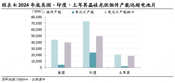 随着各国对光伏产业的重视,多国大力扶持本土光伏制造产能,目前以生产难度最低的组件为主,因此海外组件产能近年来快速扩张。由于电池片生产难度较大,海外本土组件产能远超电池片,其中海外组件产能最大的三国,即美国/印度/土耳其,2024年底本土电池片产能缺口分別高达40/50/19GW,且我们预计短期内难以明显缩小。