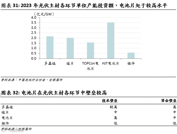 根据中国光伏行业协会统计,2023年TOPCon/HJT电池片的单位产能投资额高达1.55亿元/3.51亿元/GW,远高于组件的0.57亿元/GW,和多晶硅、硅片接近,属于资本密集型行业。电池片作为技术和资本双重密集型行业,我们认为在光伏主材各环节中壁垒较高,事实上电池片也是目前产能过剩程度最低的主材环节。