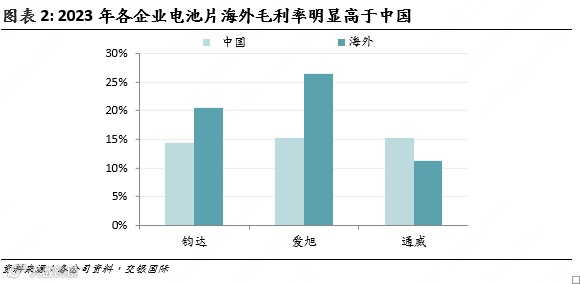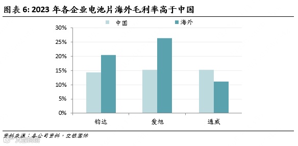 相同电池片的海外售价相比中国溢价明显,在无贸易壁垒市场,目前溢价约在0.02元/W或8%,在有贸易壁垒市场,溢价则更高,因此即使考虑海外运费更高等因素,电池片企业海外毛利率均明显高于中国,出海成为提高毛利率的重要方式。以中国龙头企业的情況为例,2023年钧达/爱旭电池片毛利率海外比国內分別高出5/10个百分点。