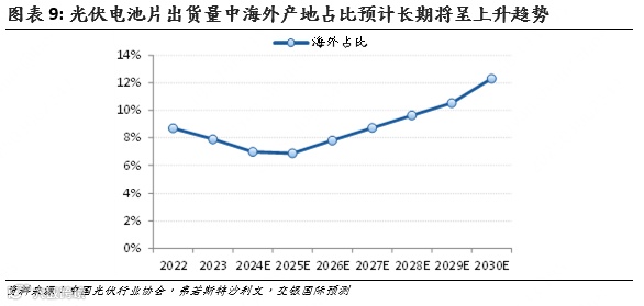 我们预计在部分国家扶持本土产能和中国企业海外建厂推动下,光伏电池片出货量中海外产地占比将由2023年的7.9%小幅提升至2030年的12.3%,其中大部分仍将来自于中国企业的海外产能。
