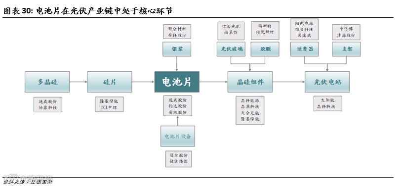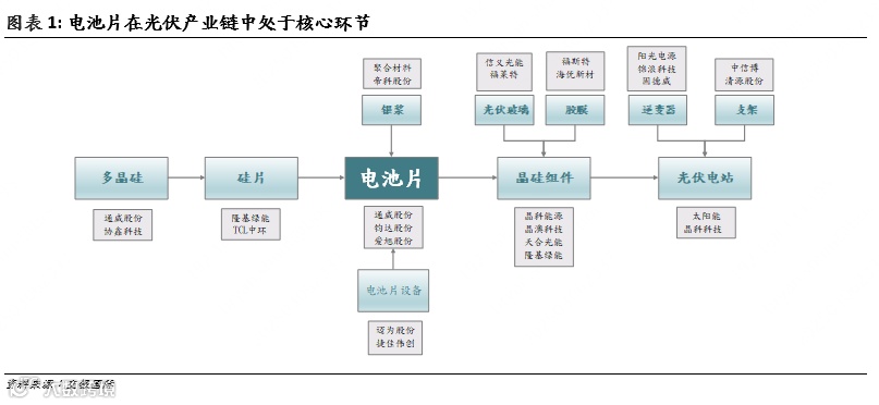电池片是光伏产业链的核心技术环节:电池片的转换效率对光伏发电成本影响较大,是光伏产业链的核心技术环节,属于技术和资本双重密集型行业,在光伏主材各环节中壁垒较高。电池片企业可分为主要销售电池的专业化企业和主要销售组件的一体化企业,目前各占约一半市场份额。