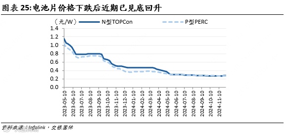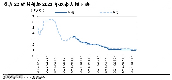 硅片:价格2023年以来持续下跌,N型硅片价格由2023年9月的3.47元/片跌至最低1元/片,直至2024年11月以来才小幅反弹。