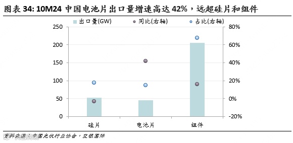 海外组件产能快速扩张导致其电池片进口需求激增。根据中国光伏行业协会统计,10M24中国光伏硅片、电池片、组件出口量为53.2/45.9/205.9GW,同比-3%/+42%/+16%,电池片增速远高于组件和硅片,在光伏主材出口量中的占比同比提升3个百分点至15%。我们预计这一趋势将长期持续,由于直接面对海外客户,海外市场的超额利润过去长期被组件企业垄断,未来则将逐渐向电池片企业转移。