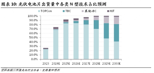 2027-29年:此后随着xBC成熟将逐渐下降,但在2029年前将继续保持主流,TBC将逐渐替代TOPCon的地位,2030年占比提升至40%,而TOPCon相关电池(包括TOPCon和TBC)占比将持续提升,并在2027-28年达到90%。