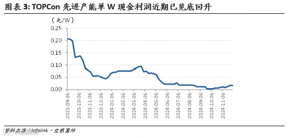 我们测算目前TOPCon先进产能单W现金利润已回升至接近0.02元/W,少数高开工率的龙头企业凭借更高的售价和更低的成本,毛利或已接近转正,但单W净利仍有亏损。