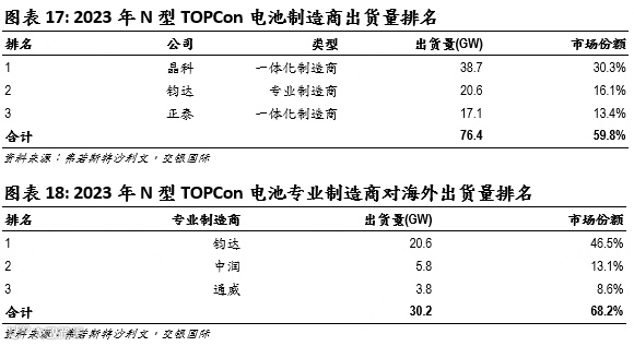 在N型领域,先发企业具有明显优势。2023年TOPCon电池片出货量中(128GW,占电池片总出货量23%),晶科、钧达、正泰位居前三,CR3市占率高达60%;专业化企业TOPCon对海外出货量中,钧达以47%的高市占率稳居第一(1H24仍保持第一),CR3市占率高达68%。N型市场集中度相比整体市场更高。