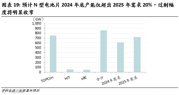 近年来行业大举扩产导致电池片产能过剩。据统计,目前TOPCon/HJT/xBC电池产能高达750/60/55GW,N型产能合计860GW,相比2024年电池片需求611GW高出多达41%,但随着需求增长,相比2025年预测需求722GW则仅高出20%,过剩幅度将明显收窄。