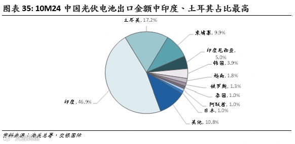 我们认为从中国的电池片出口能说明以上状況。2024年电池片出口增长主要来自印度。10M24出口出货量同比增长14.1亿个(同比32%),其中印度增长19.6亿个(同比161%),此外印尼增长2.8亿个(同比12.1倍),其他主要出口国家则大多下降,其中柬埔寨/泰国下降2.6/3.1亿个(同比-37%/-89%),降幅较大,土耳其下降1.1亿个(同比-9%)。印尼暴增和柬埔寨、泰国等国锐减主要是由于美国2024年对越南、泰国、马来西亚、柬埔寨这东南亚四国光伏组件进行双反调查,从而东南亚组件产量由这些国家转移至印尼。