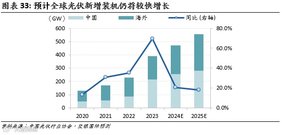 我们预计2024年海外新增装机同比增长24%至215GW,其中印度、巴基斯坦、中东等新兴市场增长迅猛,欧美市场则受到高利率影响而增长较慢。在美国降息利好推动下,我们预计海外新增装机2025年将增至275GW,增速提升至28%。