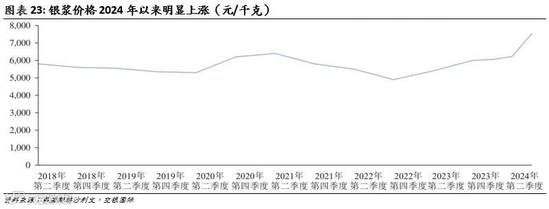 银浆:价格主要取决于银价,2024年以来银价大涨推动银浆价格由1月的6171元/千克上涨至6月的7837元/千克,目前小幅回落至约7600元/千克,但由于新技术导致单W银耗明显下降,非硅成本上升并不明显。