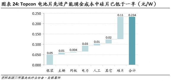 根据中国光伏行业协会的测算和目前的硅片价格,我们测算目前TOPCon电池片先进产能现金成本约0.23-0.24元/W,其中: