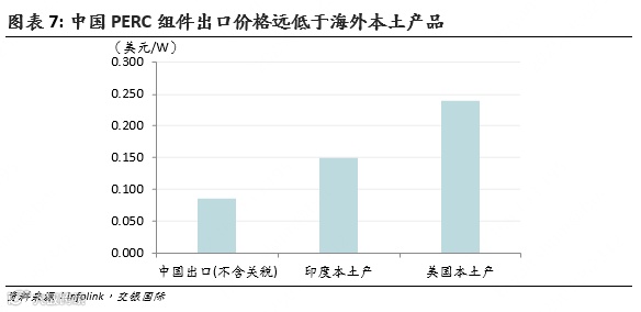 中国光伏产品的成本优势巨大,目前使用进口电池片的印度/美国本土产PERC组件价格高达0.15/0.24美元/W,远远高于0.085美元/W的中国出口价格(不含关税),而电池片环节的成本差距只会更大。