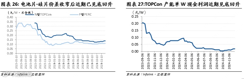 在亏损压力下,部分落后产能已被迫停产,在产产能也明显下调开工率,从而推动电池片-硅片价差2024年10月以来持续反弹,目前已反弹至0.14元/W,单W盈利拐点已现。