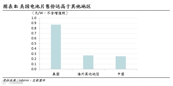 由于多重关税,美国市场电池片单W售价高达约0.87元(人民币,下同),远高于其他市场的低于0.3元。