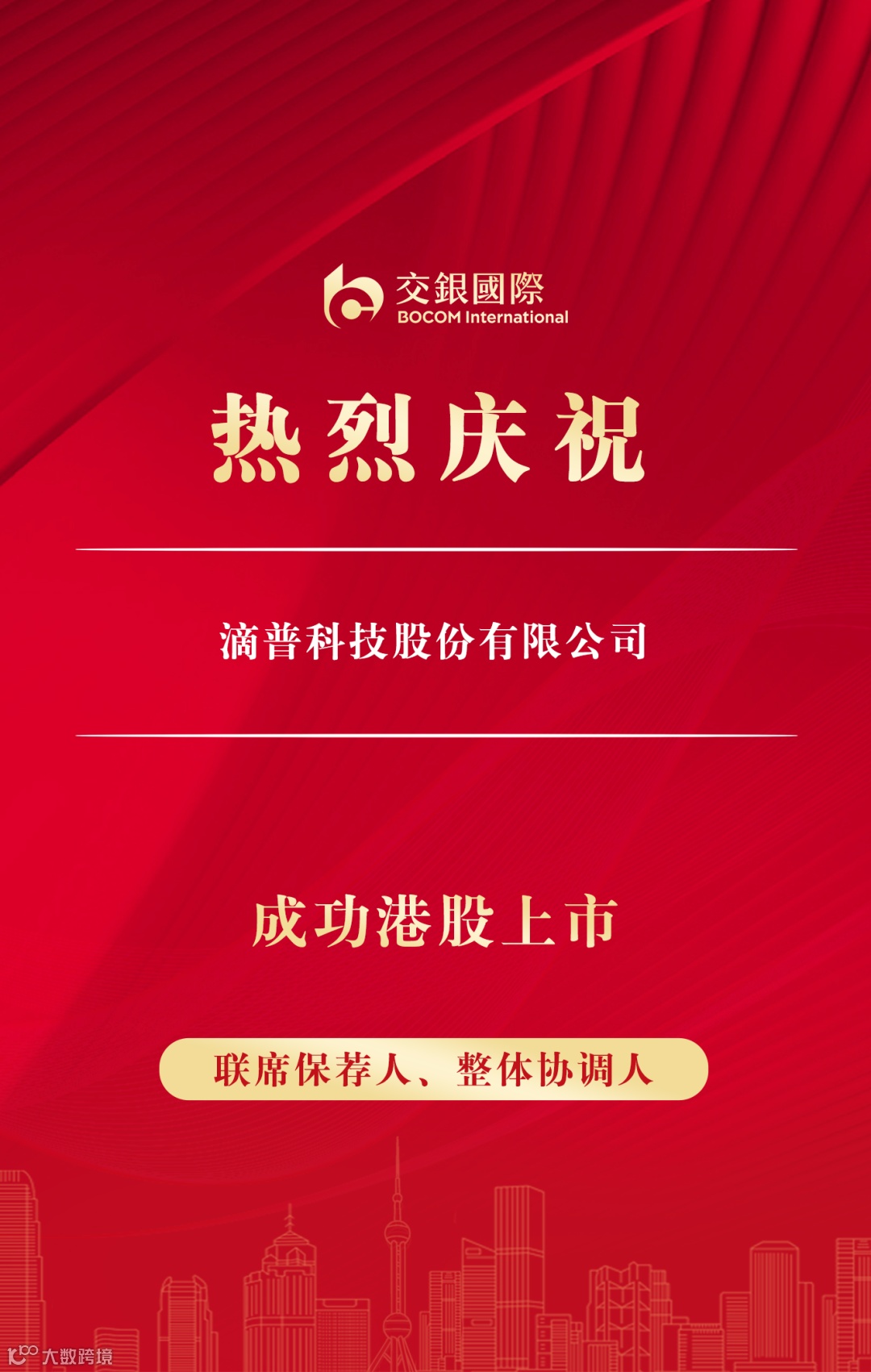 10月28日,滴普科技股份有限公司(“滴普科技”,1384.HK)在香港联交所主板挂牌上市。滴普科技本次全球发售定价为每H股26.66港元,发行26,632,000股H股,其中香港公开发售认购倍数约7,569.8倍,募资规模约7.1亿港元。交银国际担任联席保荐人、整体协调人、联席全球协调人、联席账簿管理人兼联席牵头经办人,全程深度参与并助力滴普科技香港上市项目圆满成功。