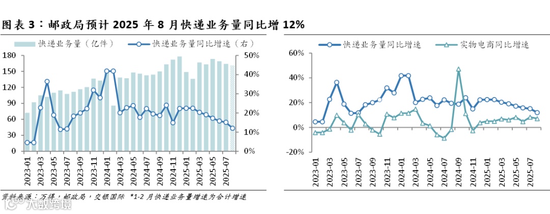 分品类看,家用电器同比增速有所回落,但仍保持双位数增长(+14%),通讯器材因去年同期高基数增速回落至个位数(+7%),家装需求持续恢复下家具增19%。邮政局预计8月快递业务量同比增12%,增速稳定。