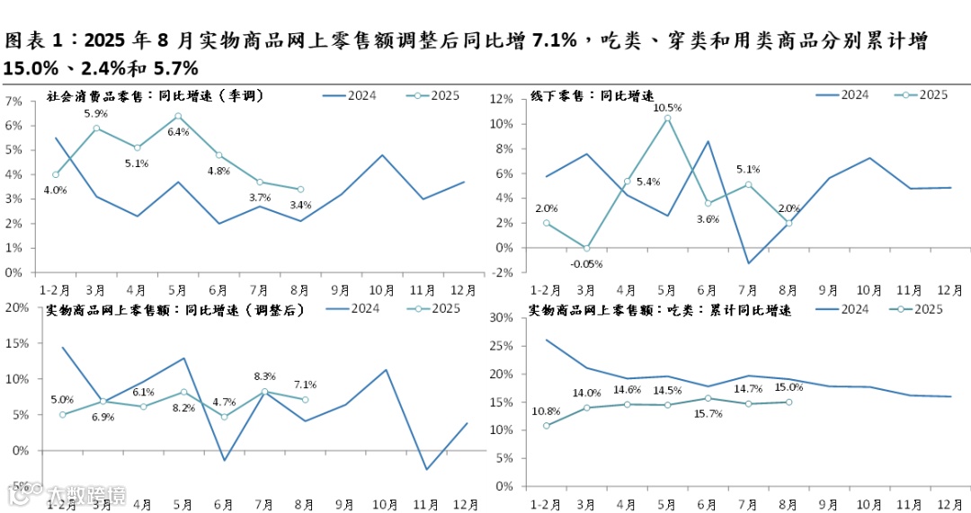 2025年8月实物电商网上零售额调整后同比增7.1%(对比7月/2季度增8.3%/6.3%)。