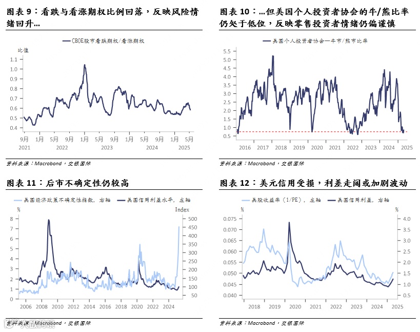 然而,值得关注的是,尽管整体风险溢价已明显回落,但在后续关税政策走向仍存在不确定性的背景下,预计投资者市场情绪依然保持谨慎。特别是近一阶段特朗普政策不确定性较大,令美元资产信用受损,而完全修复短期内预计较难实现。从美股个人投资者配置偏好上,也能反映当前市场参与者对未来经济和政策环境仍持保守态度,也是当前全球市场修复过程中需要密切关注的潜在风险因素。
