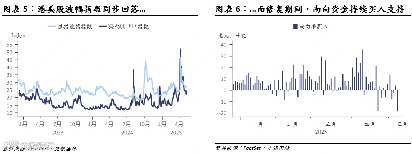 随着风险情绪持续改善,MSCI全球指数、MSCI发达市场指数以及MSCI新兴市场指数均已突破“对等关税”宣布前的水平。美股方面,标普500指数和纳斯达克指数同样呈现出显著的修复态势,已重新回到历史高位区域。港股市场自“对等关税”宣布后呈现持续修复态势,从低点稳步回升,目前已完全收回“对等关税” 宣布后的失地,当前已超过2024年10月的高点,但距离2025年3月中旬创下的前高仍有一些距离。从驱动因素分析,港股修复主要归因于风险溢价的显著回落,而无风险利率或企业盈利预期均变动不大。与此同时,4月南向资金延续了年初以来的净买入态势,也为港股市场提供了强有力支撑,并有效平抑了市场波动。