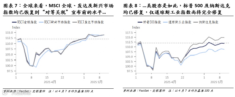 从全球市场表现来看,随着风险情绪持续改善,MSCI全球指数、MSCI发达市场指数以及MSCI新兴市场指数均已突破“对等关税”出台前的水平。美股方面,标普500指数和纳斯达克综合指数同样呈现出显著的修复态势,重新站上历史高位区域。