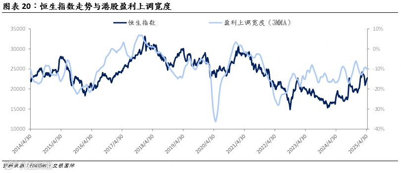 尽管美国对华30%关税水平仍高,且24%的关税仍处于90天暂停状态,但中美首次谈判成果超预期,且仍可预期双方关税谈判将持续向建设性方向发展,有效降低了全球贸易和衰退风险,短期内风险情绪趋于平稳。关税风险降低对美债利率影响呈双向性:一方面降低滞胀风险导致降息预期收窄或推高利率中枢,另一方面利好修复美元信用风险从而又压低利率,预计美债利率将窄幅波动,对港股影响偏中性。基本面方面,中国出口韧性持续,内需政策组合加速推进,包括央行降准降息、消费刺激、房地产支持和政府债发行提速等多层次政策体系,企业盈利预期有望回归中性偏积极。