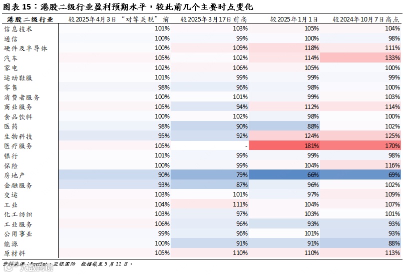从港股行业表现来看,多数行业的价格和估值水平已较4月初“对等关税“宣布时完全修复。信息技术和半导体等前期引领科技结构性行情的景气成长板块,尽管此前经历了较大幅度回调,但目前已接近全面修复。而内需驱动型的家电、运动鞋服、食品饮料等消费板块,以及公用事业、原材料等高股息防御性板块,已突破前期高点。企业盈利预期整体受关税政策影响相对有限,少数周期性板块出现小幅下修,绝大多数行业的盈利预期保持平稳。
