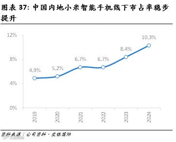 2024年,小米在中东/非洲/拉美/东南亚的智能手机出货量分别同比提升了18%/38%/20%/26%。3Q24小米在中东/非洲/拉美/东南亚的份额分别为16.4%/11.7%/16.4%/15.5%。管理层表示,中东/非洲/拉美是目前最有潜力的三大市场,小米在这三个地区市占率的长期目标为中东25%/非洲20%/拉美20%。印度市场是小米最先扩展的海外市场,其在印度的市场份额曾一度达到1Q20的31.2%,其后受到印度政策环境、印度本土品牌以及三星等竞争者加入低端机型竞争等影响,小米在印度智能手机市场份额从2021年开始一路下滑,2023/24年保持在17.4%/17.6%的水平。我们认为小米在印度市场成功拓展的经验可以复制到中东/非洲/拉美/东南亚等新兴市场。