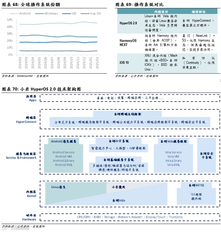 我们认为,HyperOS 2.0目前的内核层设计对Linux还有依赖(图表70),HyperConnect也较为依赖Wi-Fi/蓝牙硬件,因此在延迟/连接数/抗干扰/功耗等方面还面临挑战。但我们也看到了HyperOS 2.0未来机遇:1)HyperConnect开放兼容的特性可以连接第三方设备,从而兼容覆盖更多场景;2)Hyper OS 2.0显著提升了人、车、家协同效应,有助于推动智能手机/AIoT/汽车的高端化;3)中长期看,HyperOS有望成为全球少数拥有人、车、家全场景的操作系统,有助于提升互联网服务收入(如通过定制AI服务、汽车自动驾驶增值服务收费等),也有望助力小米从传统硬件巨头蜕变成较为领先的生态级公司。