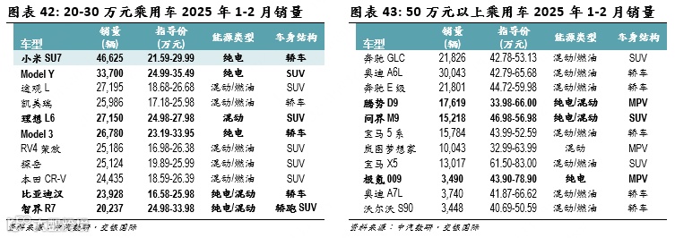 SU7 Ultra发布,初探50万元以上高端纯电轿跑市场。小米在2025年2月发布的SU7 Ultra,指导价52.99万元,触及50万元以上高端价格段。根据乘联会数据,以2025年前2个月销量排行为例,目前50万元以上价格段还没有纯电轿车,目前销量排名靠前的50万元以上轿车主要以混动/燃油为主。而管理层表示,小米SU7 Ultra首批交付车主中,50%-60%的车主曾经买过BBA等高端车型。我们认为这一定程度反映了小米在50万元以上价格段份额抢占的方向,即之前的高端燃油车主。